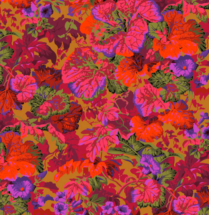 A beautiful vibrant floral in red and purple with green leaves on a caramel background.